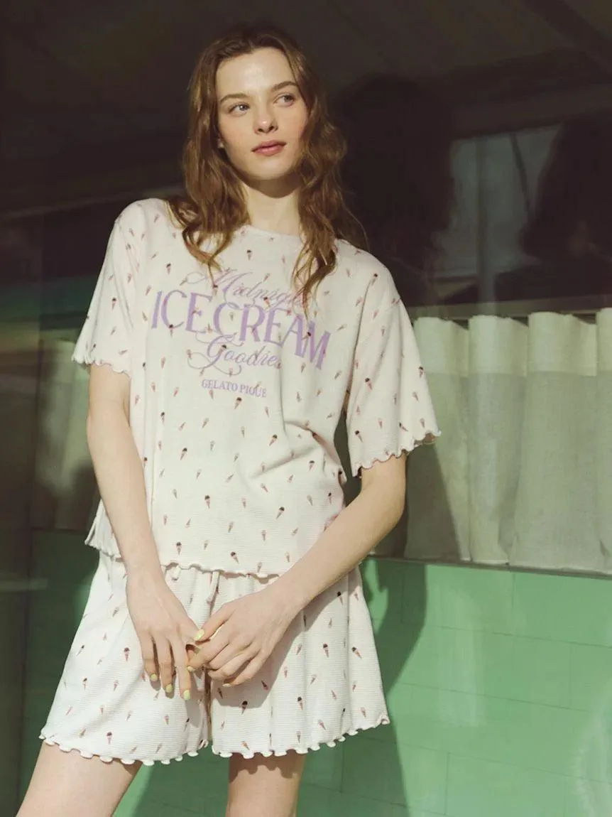 [Waffle pullover with a cool touch and studded with cute ice cream patterns]