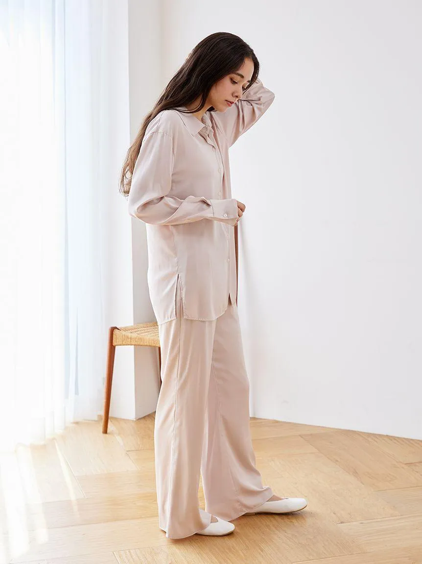 Effortlessly elegant, the Long Sleeve Satin Sleepwear Blouse elevates your nighttime wardrobe with its luxurious sheen and unparalleled comfort. The smooth satin material drapes beautifully, offering a flattering yet relaxed fit. Its classic button-up design, paired with a pointed collar, creates a timeless aesthetic suitable for both lounging and bedtime elegance. The blouse features a lightweight texture that ensures a breathable experience, making it perfect for year-round wear. Designed with long sleeves for added warmth, this blouse provides the perfect balance of sophistication and coziness. The soft, neutral tones enhance its versatility, seamlessly complementing any sleepwear bottoms. Whether paired with matching satin pants or styled individually, this sleepwear blouse redefines loungewear chic.