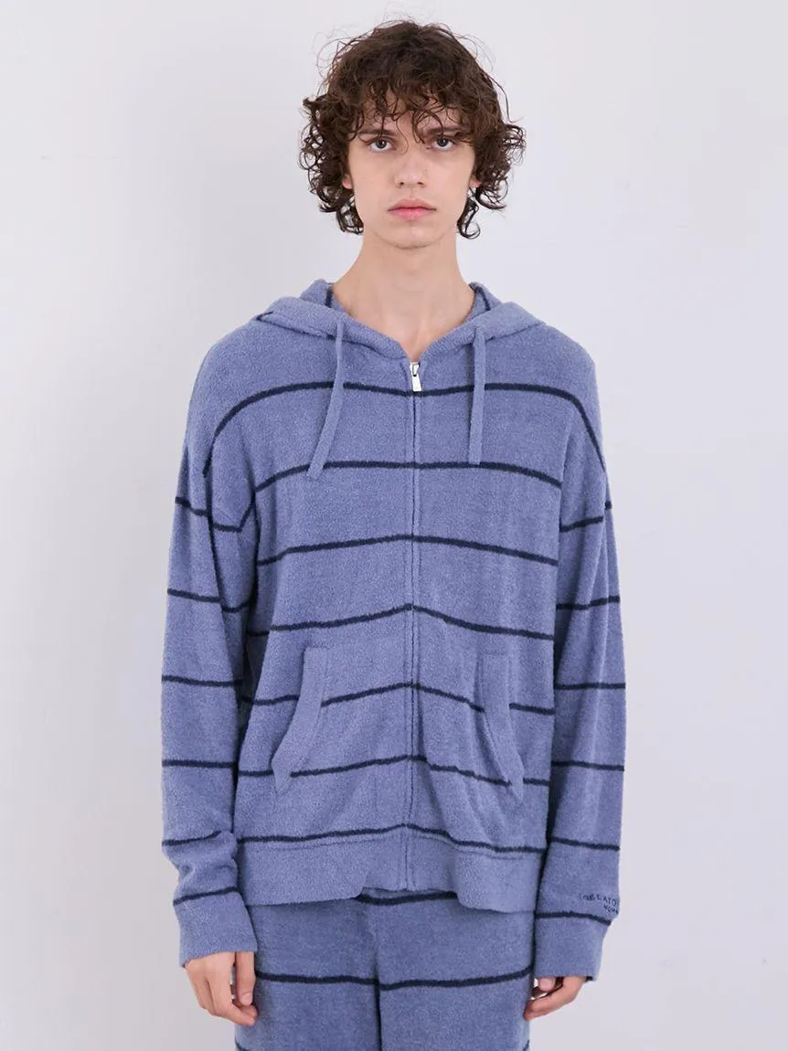 This zip-up hoodie features a classic striped design in calming blue tones, adding a touch of sophistication to your loungewear collection. The full front zipper provides convenience for easy wear and versatile styling, while the attached hood offers an added layer of warmth. Two front pockets provide a functional touch, perfect for keeping your hands warm or storing small essentials. The relaxed fit and ribbed detailing on the cuffs and hem contribute to a polished yet comfortable look.