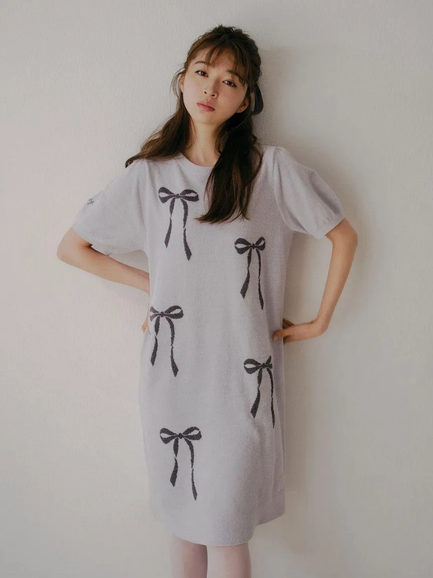 Crafted from a soft and lightweight jacquard knit fabric, the dress offers a smooth, breathable feel against the skin. Adorned with delicate bow motifs woven directly into the fabric, it captures a timeless aesthetic with a playful twist. The short puff sleeves add a subtle volume, while the relaxed silhouette ensures freedom of movement and all-day ease.