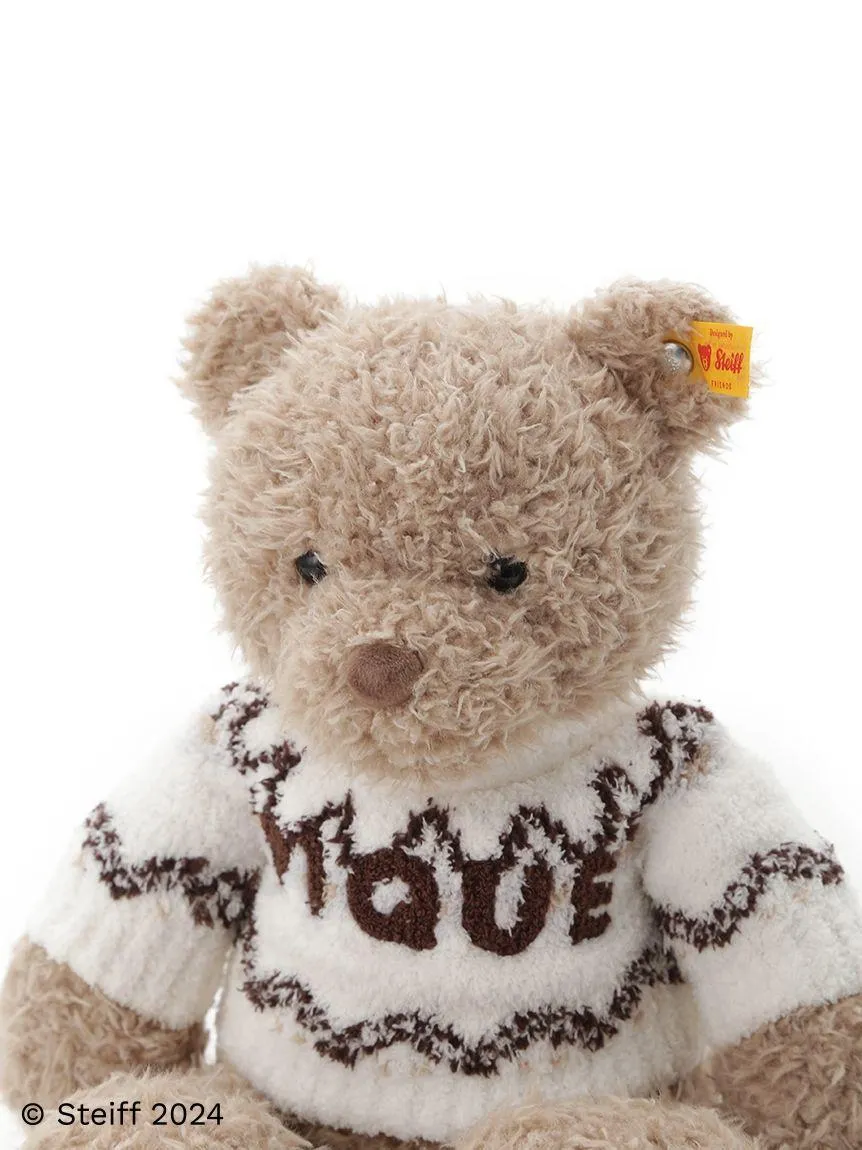 Indulge in the delightful fusion of tradition and coziness with the [Steiff] Teddy Bear Jimmy × Gelato Pique. This charming teddy bear, a product of the prestigious collaboration between Steiff and Gelato Pique, embodies a perfect blend of timeless craftsmanship and modern aesthetic. Teddy Bear Jimmy features the signature soft, fluffy texture that Steiff is renowned for, made from luxurious materials that ensure a cuddly and comforting experience. Dressed in a distinctive Gelato Pique sweater, this bear showcases a stylish, cozy design with "Pique" playfully knitted across the front in a contrasting color, highlighting the unique collaboration. The classic Steiff button-in-ear tag guarantees authenticity and quality, making this bear not just a toy, but a collectible. Its endearing face, with carefully stitched features and sparkling eyes, adds a lifelike charm that appeals to both children and collectors alike. Packaged in a beautifully designed box that mirrors the bear's aesthetic, it makes a perfect gift or a precious keepsake.